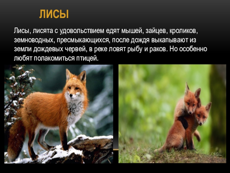 лисыЛисы, лисята с удовольствием едят мышей, зайцев, кроликов, земноводных, пресмыкающихся, после дождя выкапывают из земли дождевых червей,