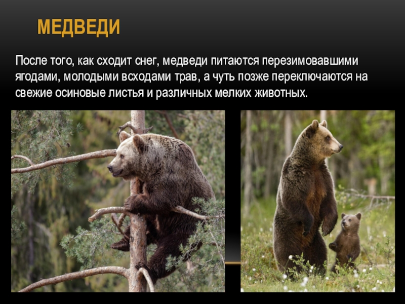 Медведи После того, как сходит снег, медведи питаются перезимовавшими ягодами, молодыми всходами трав, а чуть позже переключаются