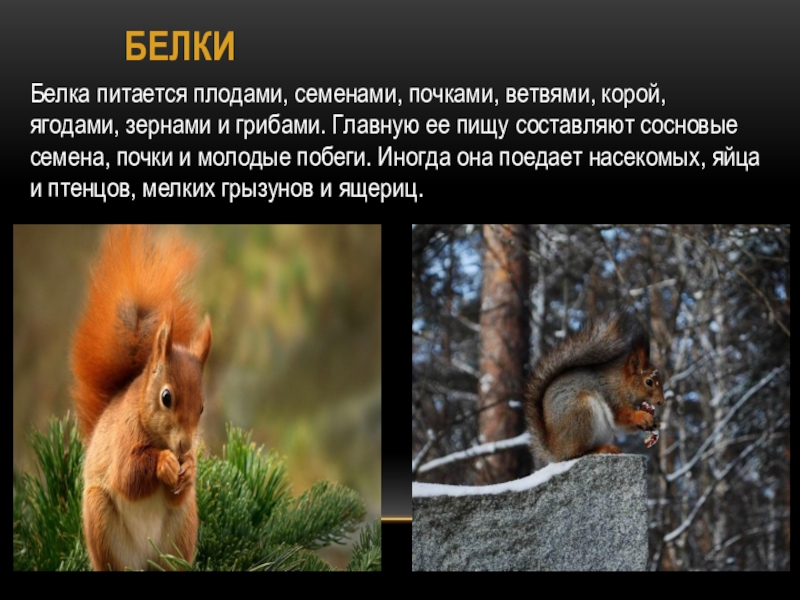 БЕЛКИБелка питается плодами, семенами, почками, ветвями, корой, ягодами, зернами и грибами. Главную ее пищу составляют сосновые семена,