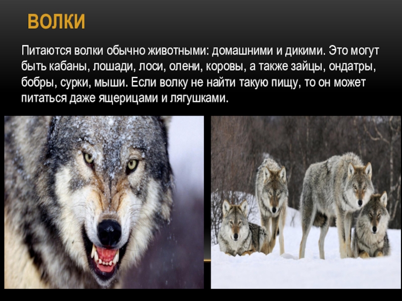 волкиПитаются волки обычно животными: домашними и дикими. Это могут быть кабаны, лошади, лоси, олени, коровы, а также