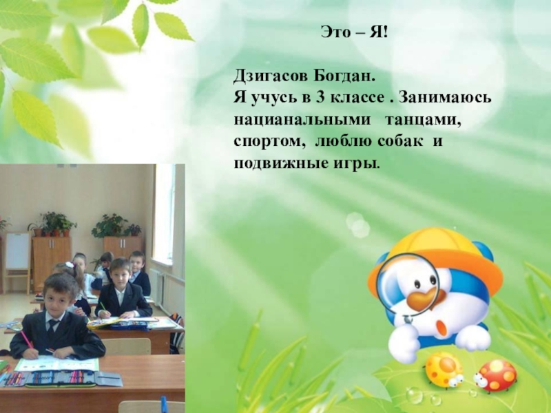 Я учусь в 3 классе . Занимаюсь нацианальными танцами, спортом, люблю собак и подвижные игры.