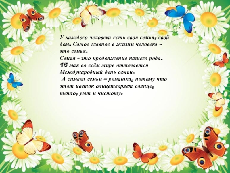 А символ семьи – ромашка, потому что этот цветок олицетворяет солнце, тепло, уют и чистоту.