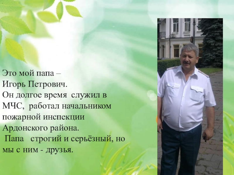 МЧС, работал начальником пожарной инспекции Ардонского района.