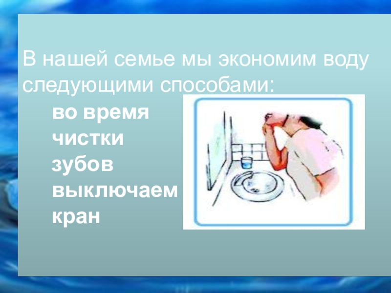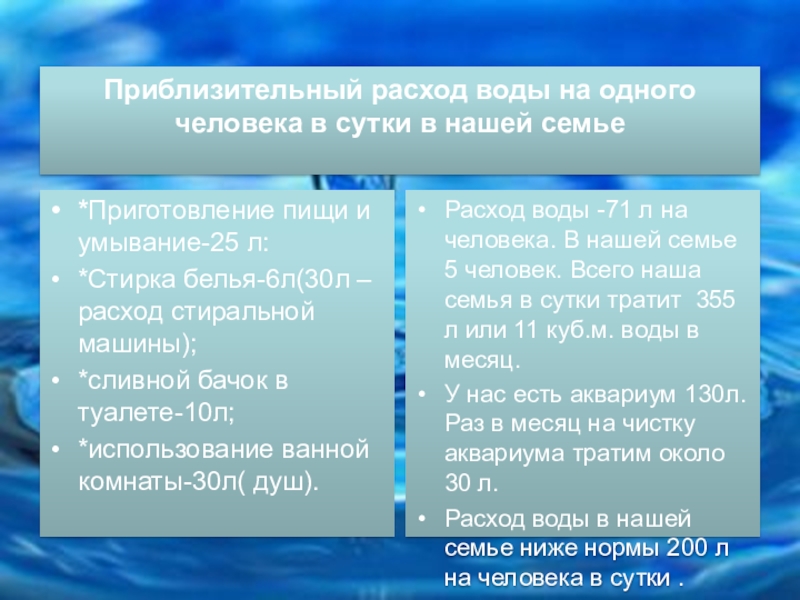 Расход воды в нашей семье ниже нормы 200 л на человека в сутки .