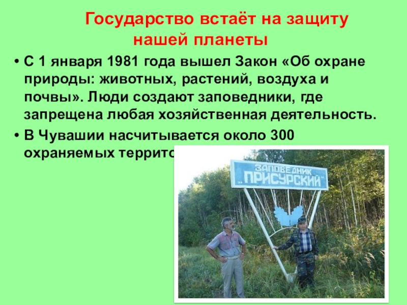 С 1 января 1981 года вышел Закон «Об охране природы: животных, растений, воздуха и почвы». Люди создают заповедники, где запрещена любая хозяйственная деятельность.