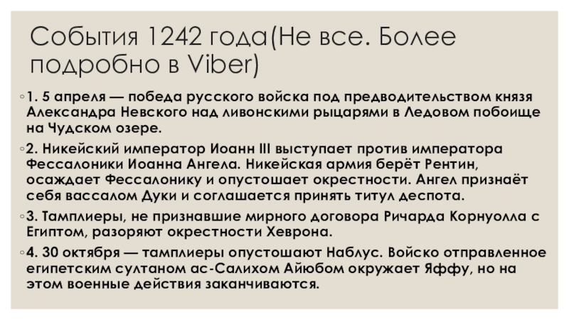 1. Произошла победа русского войска под предводительством князя Александра Невского рыцарями.