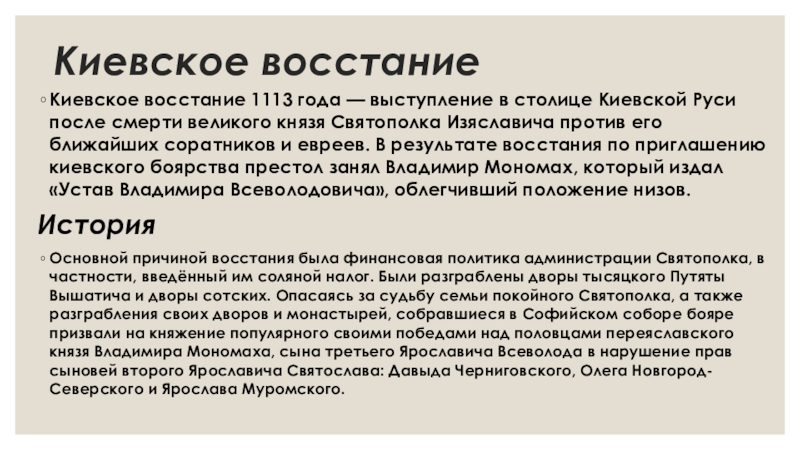 3. В результате восстания по приглашению киевского боярства престол занял Владимир Мономах.