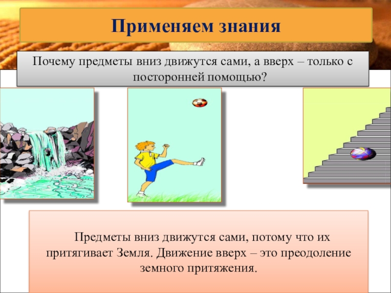 Предметы вниз движутся сами, потому что их притягивает Земля. Движение вверх – это преодоление земного притяжения.