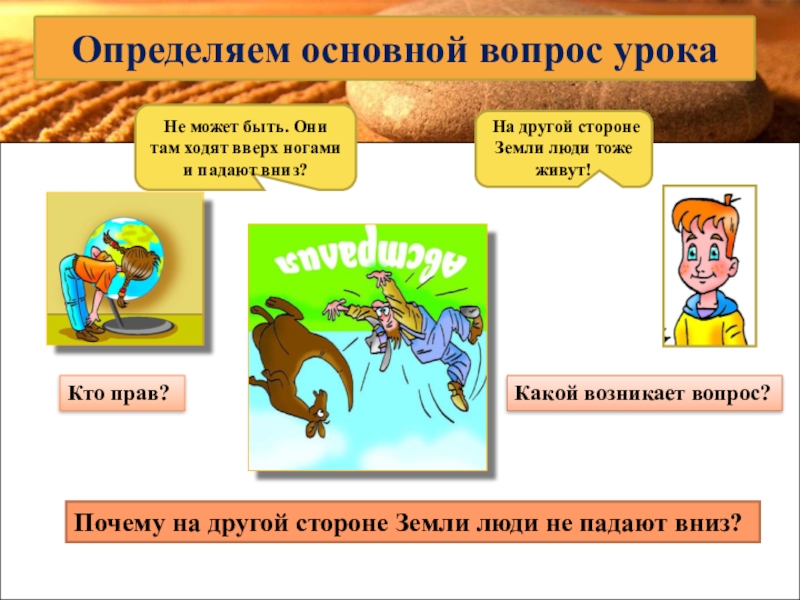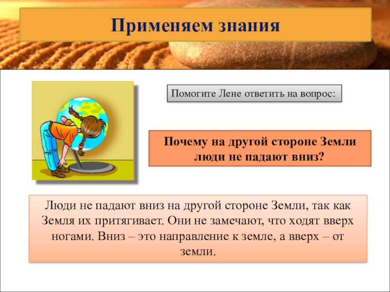 Люди не падают вниз на другой стороне Земли, так как Земля их притягивает. Они не замечают, что ходят вверх ногами. Вниз – это направление к земле, а вверх – от земли.