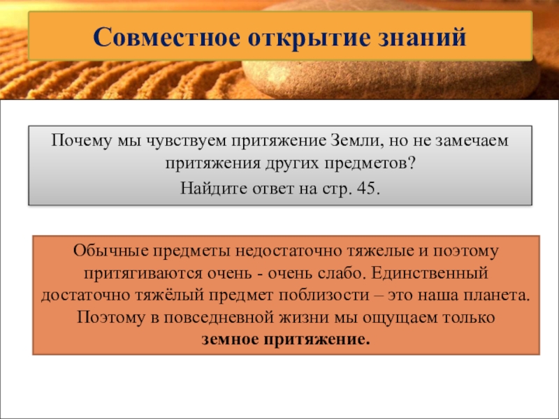 Обычные предметы недостаточно тяжелые и поэтому притягиваются очень - очень слабо. Единственный достаточно тяжёлый предмет поблизости – это наша планета. Поэтому в повседневной жизни мы ощущаем только
