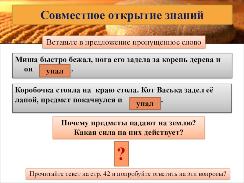 Коробочка стояла на краю стола. Кот Васька задел её лапой, предмет покачнулся и _______ .