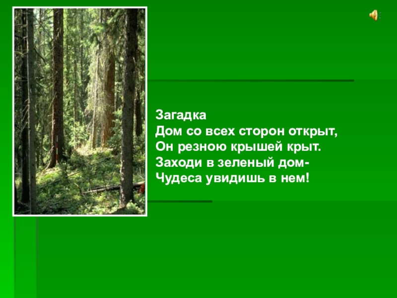ЗагадкаДом со всех сторон открыт,Он резною крышей крыт.Заходи в зеленый дом-Чудеса увидишь в нем!
