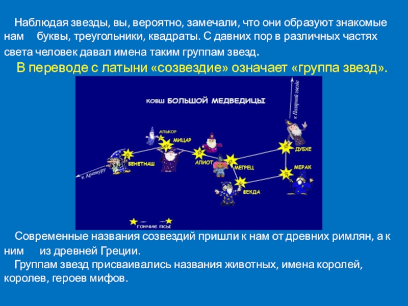 Наблюдая звезды, вы, вероятно, замечали, что они образуют знакомые нам   буквы, треугольники, квадраты.