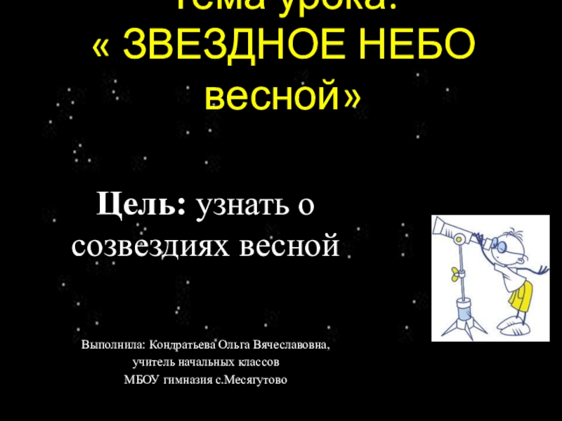 Тема урока: « ЗВЕЗДНОЕ НЕБО весной»Цель: узнать о созвездиях веснойВыполнила: Кондратьева Ольга Вячеславовна, учитель начальных классовМБОУ гимназия с.Месягутово