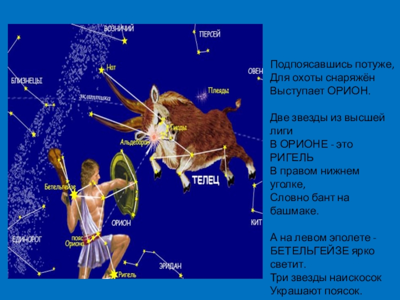 Подпоясавшись Подпоясавшись потуже,Для охоты снаряжёнВыступает ОРИОН.Две звезды из высшей лигиВ ОРИОНЕ - это РИГЕЛЬВ правом нижнем уголке,Словно