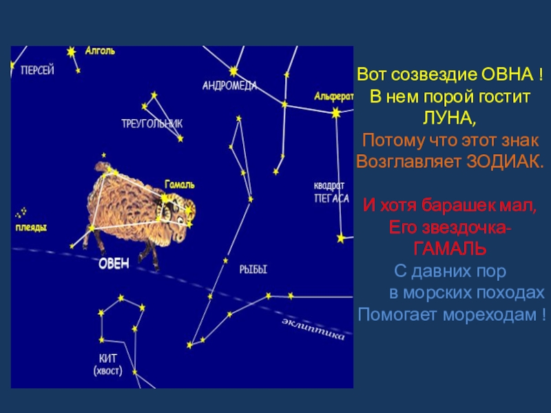 ЗОДИАК. И хотя барашек мал, Его звездочка- ГАМАЛЬ С давних пор в морских походах Помогает мореходам !