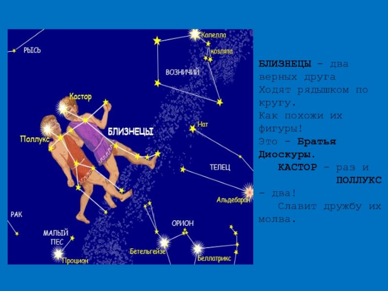 БЛИЗНЕЦЫ - два верных другаХодят рядышком по кругу.Как похожи их фигуры!Это - Братья Диоскуры.  КАСТОР -