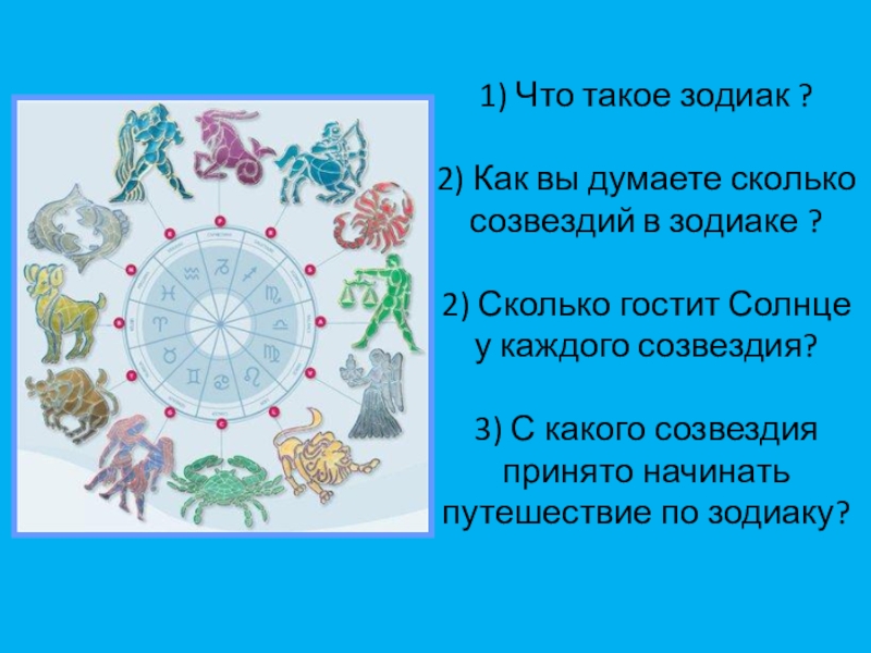 зодиаке ? 2) Сколько гостит Солнце у каждого созвездия? 3) С какого созвездия принято начинать путешествие по зодиаку?