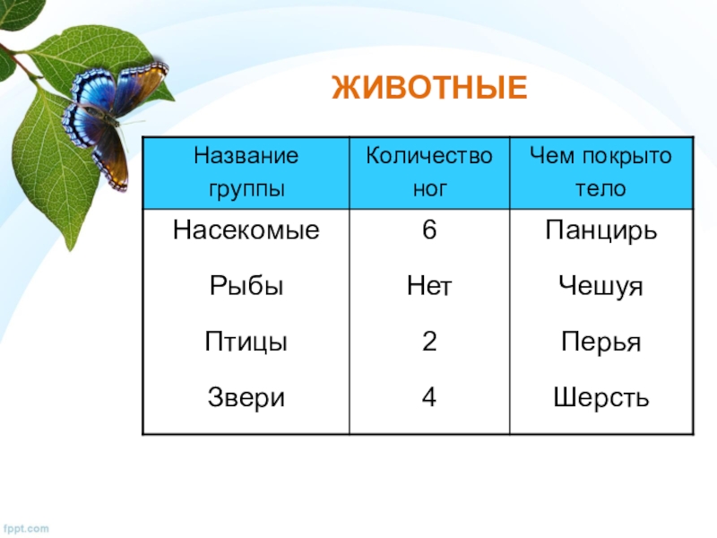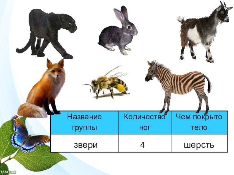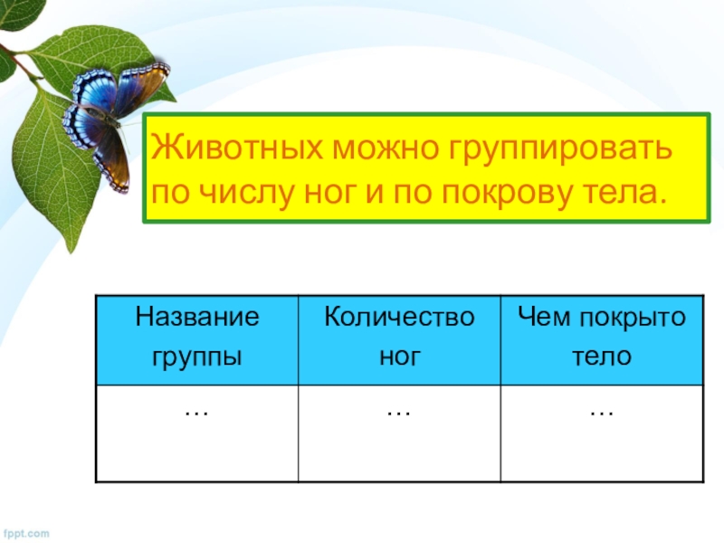 Слайд 7Животных можно группировать по числу ног и по покрову тела.