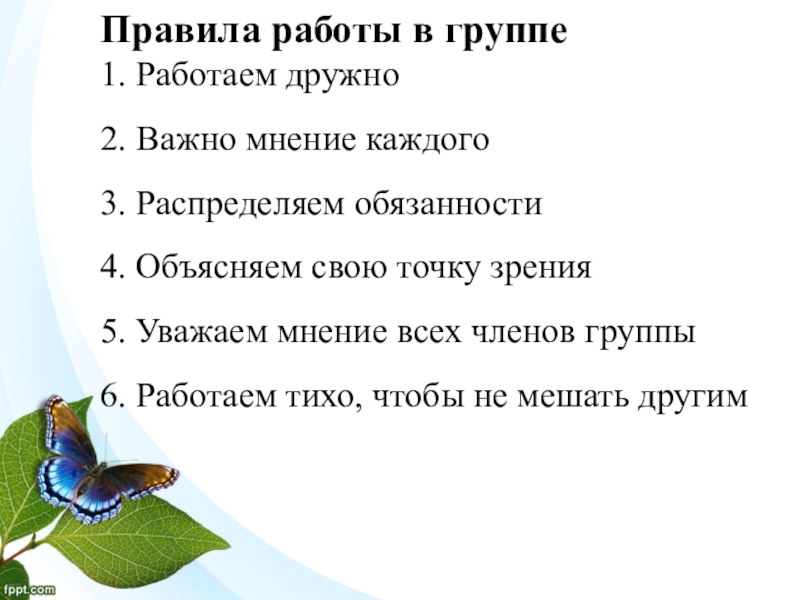 Правила работы в группе1. Работаем дружно2. Важно мнение каждого3. Распределяем обязанности4. Объясняем свою точку зрения5. Уважаем мнение