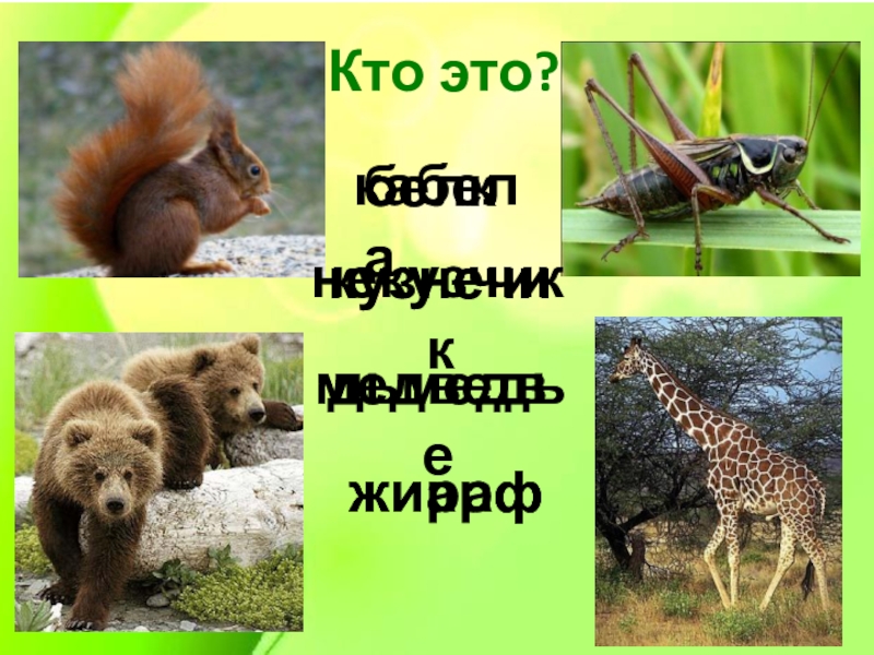 жирафмедведькузнечикбелкаКто это?кабел жиарфнекузчик дьмедве
