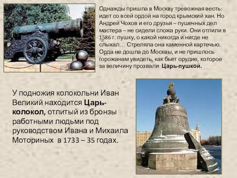 город крымский хан. Но Андрей Чохов и его друзья – пушечных дел мастера – не сидели сложа руки. Они отлили в 1586 г. пушку, о какой никогда и нигде не слыхал… Стреляла она каменной картечью. Орда не дошла до Москвы, и не пришлось горожанам увидеть, как бьет орудие, которое за величину прозвали Царь-пушкой.