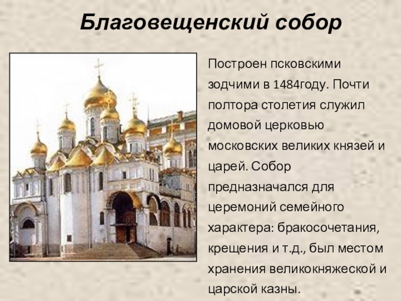 московских великих князей и царей. Собор предназначался для церемоний семейного характера: бракосочетания, крещения и т.д., был местом хранения великокняжеской и царской казны.