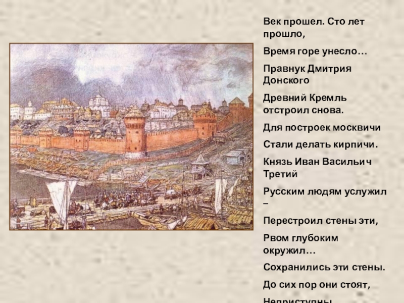 конце XV века при великом московском князе Иване III, смелом, волевом и решительном человеке. Он заботился о том, чтобы стольный град был надежно укреплен и чтобы выглядел торжественным, величавым, «красно украшенным».