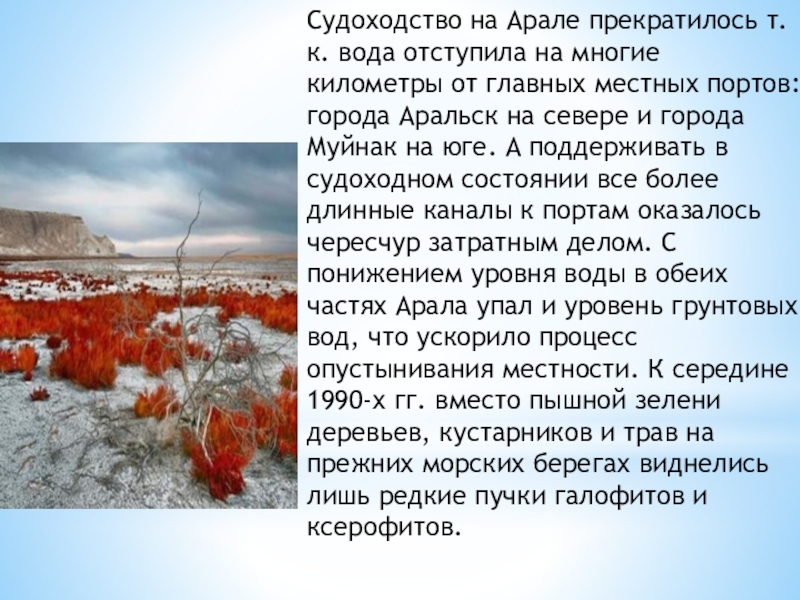 главных местных портов: города Аральск на севере и города Муйнак на юге. А поддерживать в судоходном состоянии все более длинные каналы к портам оказалось чересчур затратным делом. С понижением уровня воды в обеих частях Арала упал и уровень грунтовых вод, что ускорило процесс опустынивания местности. К середине 1990-х гг. вместо пышной зелени деревьев, кустарников и трав на прежних морских берегах виднелись лишь редкие пучки галофитов и ксерофитов.