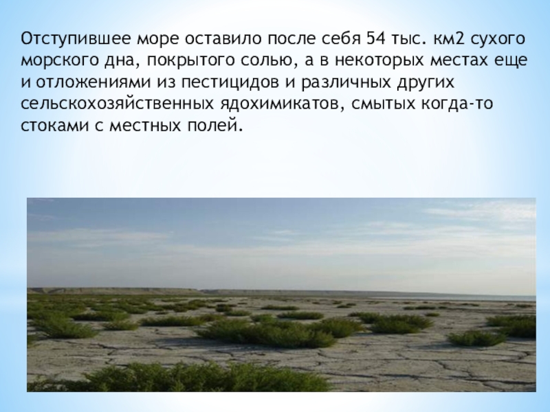 Слайд 11Отступившее море оставило после себя 54 тыс. км2 сухого морского дна,