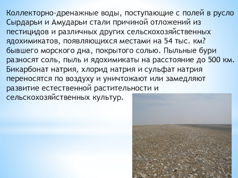 причиной отложений из пестицидов и различных других сельскохозяйственных ядохимикатов, появляющихся местами на 54 тыс. км? бывшего морского дна, покрытого солью. Пыльные бури разносят соль, пыль и ядохимикаты на расстояние до 500 км. Бикарбонат натрия, хлорид натрия и сульфат натрия переносятся по воздуху и уничтожают или замедляют развитие естественной растительности и сельскохозяйственных культур.