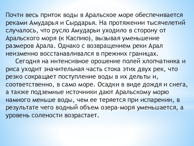 Слайд 4Почти весь приток воды в Аральское море обеспечивается реками Амударья и