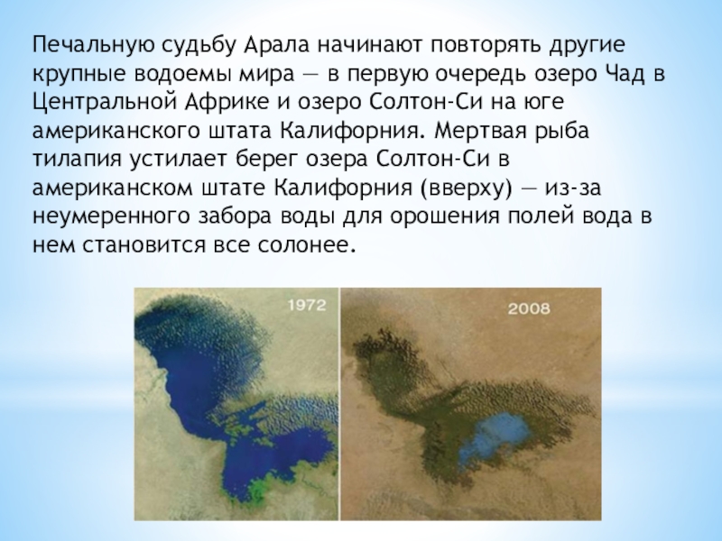 первую очередь озеро Чад в Центральной Африке и озеро Солтон-Си на юге американского штата Калифорния. Мертвая рыба тилапия устилает берег озера Солтон-Си в американском штате Калифорния (вверху) — из-за неумеренного забора воды для орошения полей вода в нем становится все солонее.
