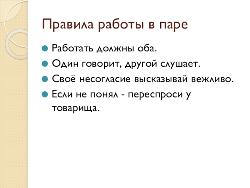 Правила работы в пареРаботать должны оба.Один говорит, другой слушает.Своё несогласие высказывай вежливо.Если не понял - переспроси у