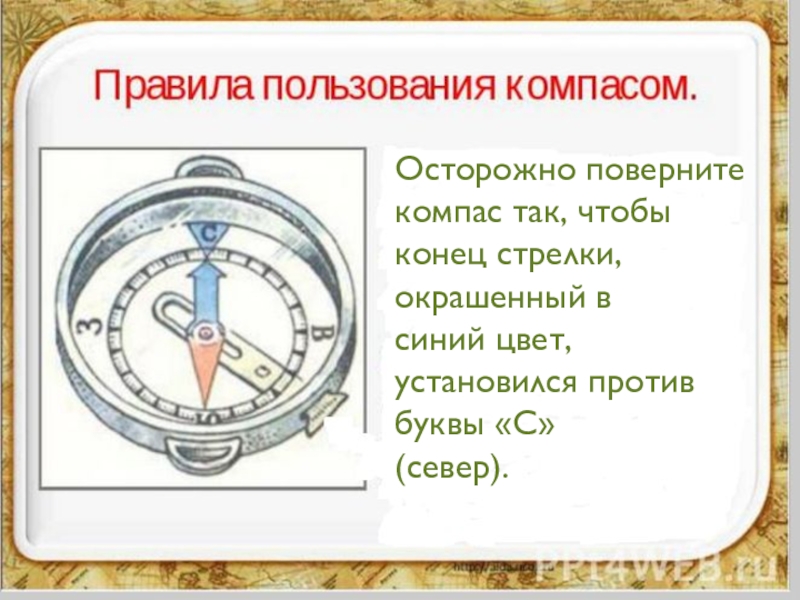 Осторожно поверните компас так, чтобы конец стрелки, окрашенный в синий цвет, установился против буквы «С»(север).