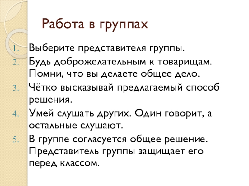 Работа в группахВыберите представителя группы.Будь доброжелательным к товарищам. Помни, что вы делаете общее дело.Чётко высказывай предлагаемый способ