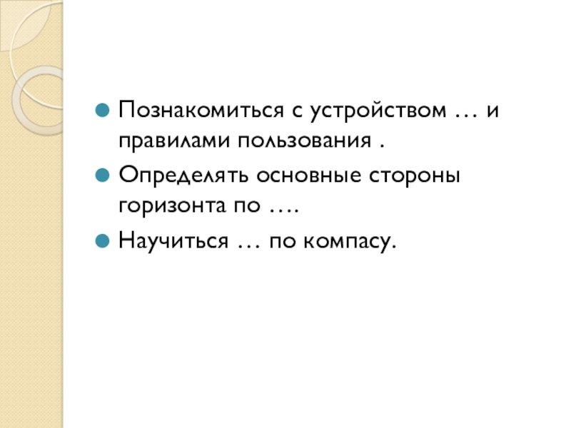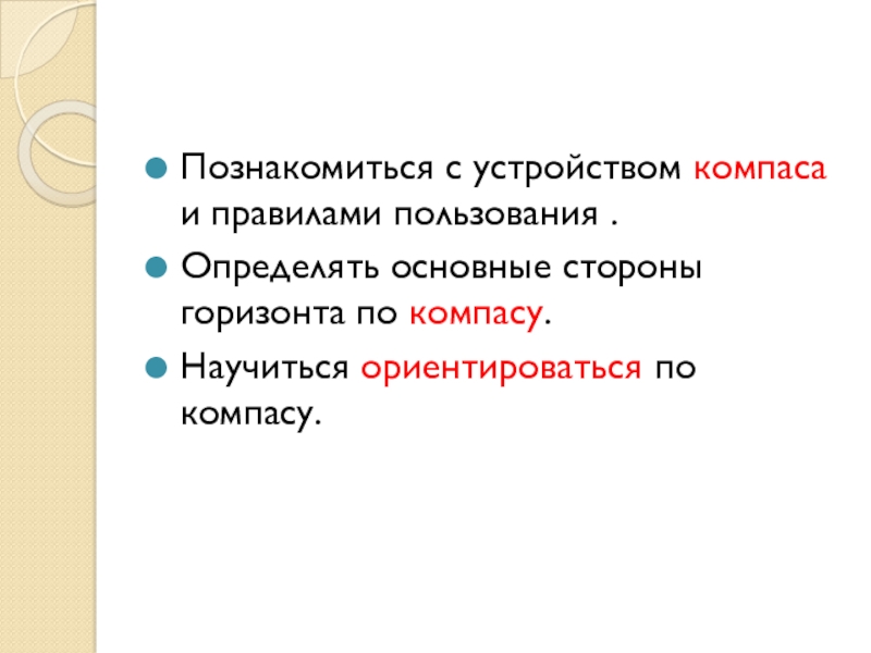 Познакомиться с устройством … и правилами пользования .Определять основные стороны горизонта по ….Научиться … по компасу.