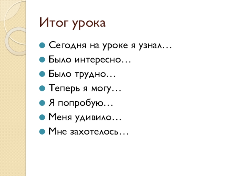 Итог урокаСегодня на уроке я узнал…Было интересно…Было трудно…Теперь я могу…Я попробую…Меня удивило…Мне захотелось…