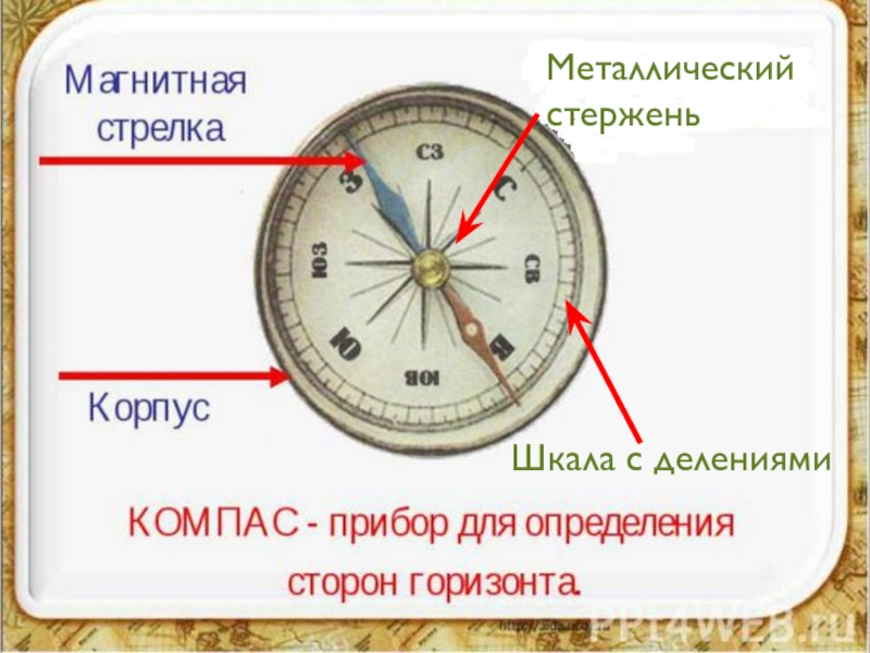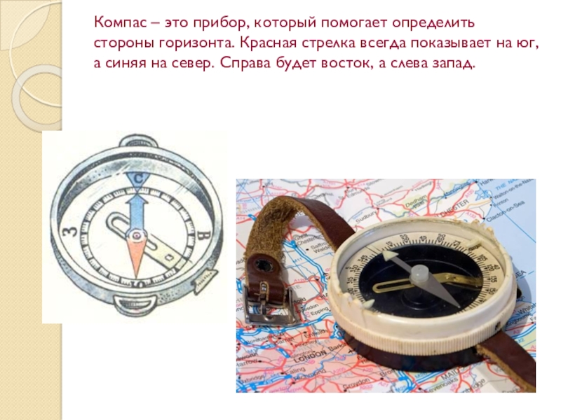 Слайд 14Компас – это прибор, который помогает определить стороны горизонта. Красная стрелка всегда
