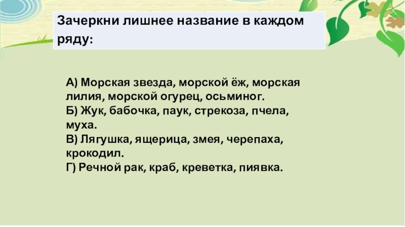 А) Морская звезда, морской ёж, морская лилия, морской огурец, осьминог.Б) Жук, бабочка, паук, стрекоза, пчела, муха.В) Лягушка,
