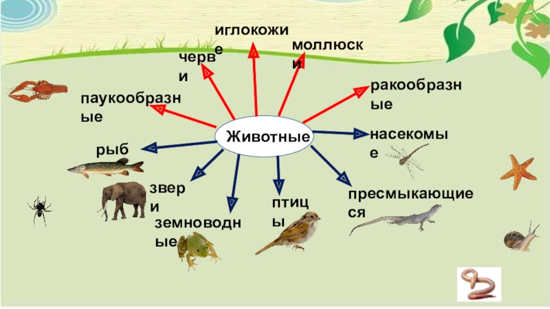 Животныенасекомыепресмыкающиесярыбыптицызвериземноводныечервииглокожиемоллюскипаукообразныеракообразные