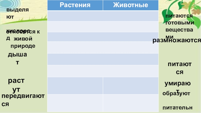 относятся к живой природедышатпитаютсяразмножаютсярастутумираютвыделяют кислородобразуют питательные веществапередвигаютсяпитаются готовыми веществами
