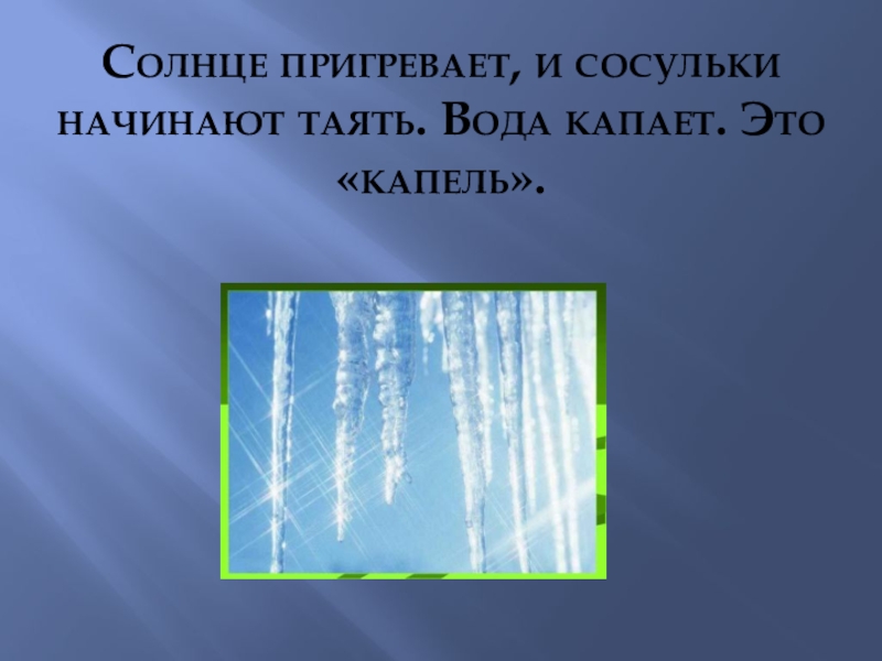Слайд 2Солнце пригревает, и сосульки начинают таять. Вода капает. Это «капель».