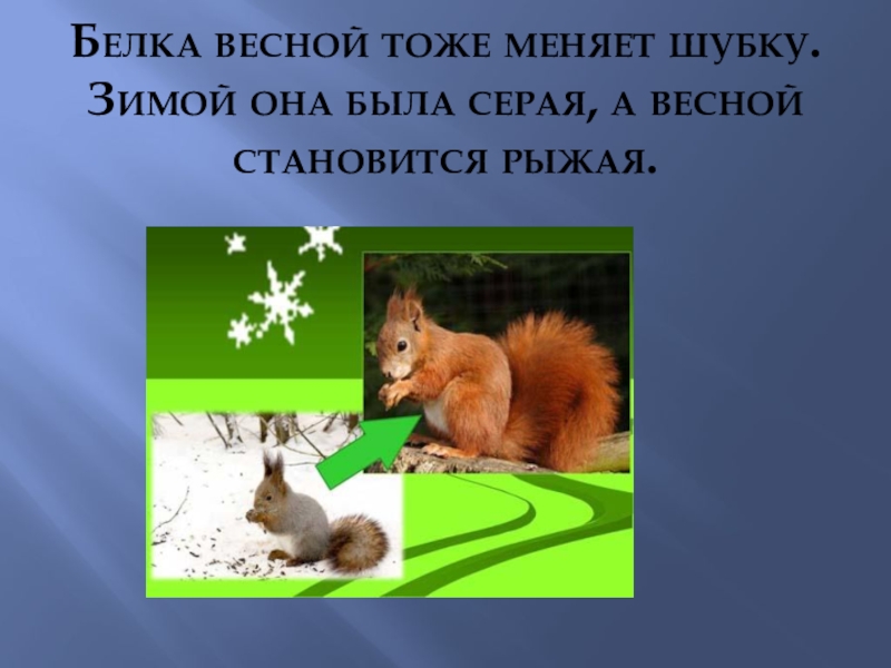 Слайд 12Белка весной тоже меняет шубку. Зимой она была серая, а весной