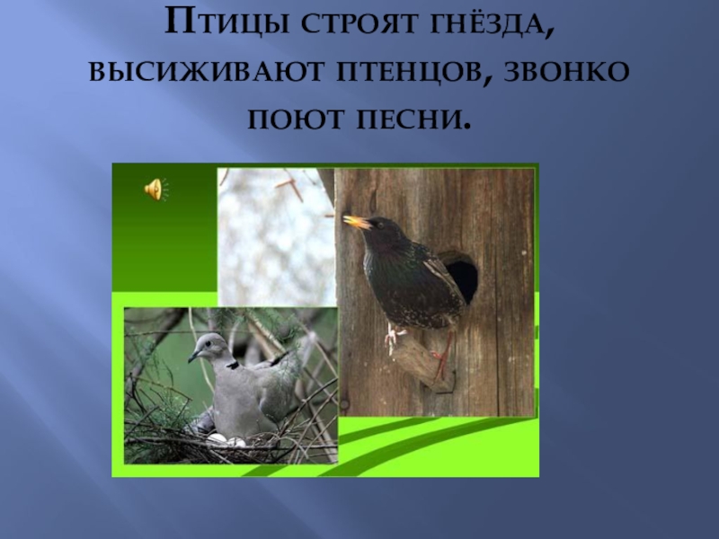 Слайд 9Птицы строят гнёзда, высиживают птенцов, звонко поют песни.