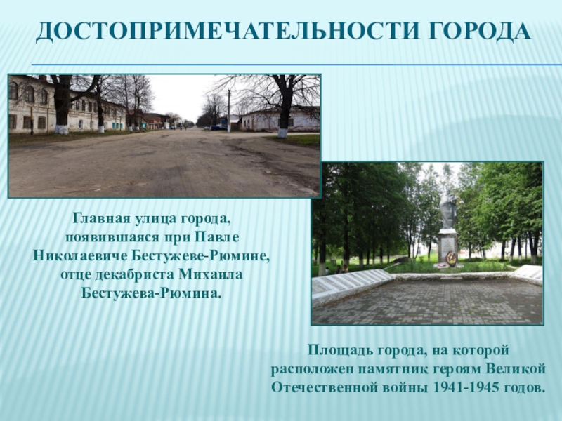 Главная улица города, появившаяся при Павле Николаевиче Бестужеве-Рюмине, отце декабриста Михаила Бестужева-Рюмина.