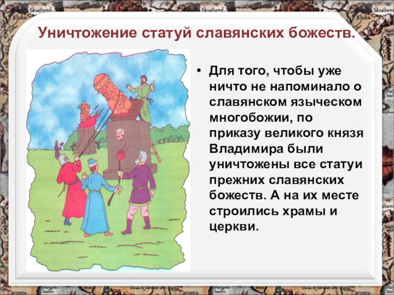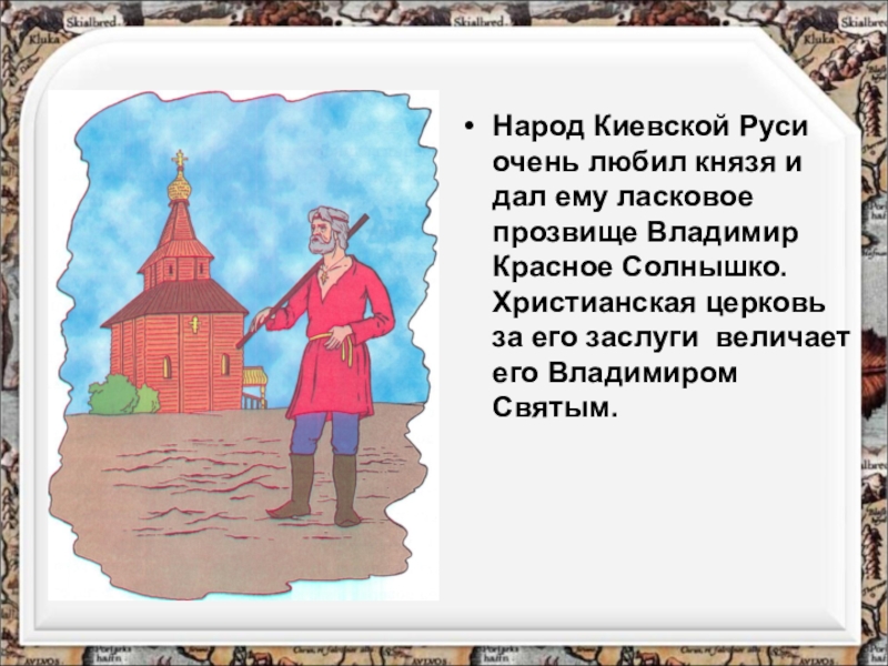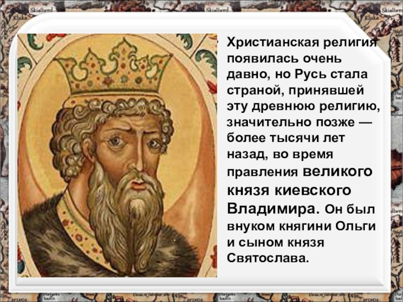 Во время княжения Владимира, в 988 году, началось крещение Руси — принятие новой религии - христианства.
