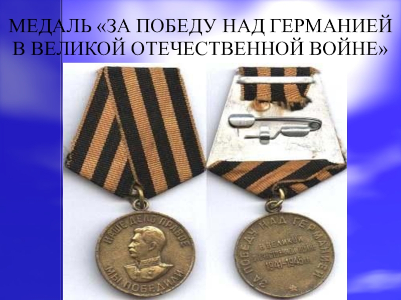 Слайд 21МЕДАЛЬ «ЗА ПОБЕДУ НАД ГЕРМАНИЕЙ В ВЕЛИКОЙ ОТЕЧЕСТВЕННОЙ ВОЙНЕ»