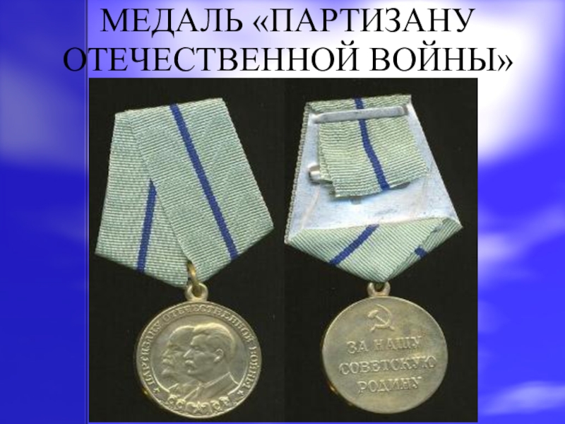 Слайд 23МЕДАЛЬ «ПАРТИЗАНУ ОТЕЧЕСТВЕННОЙ ВОЙНЫ» I степени