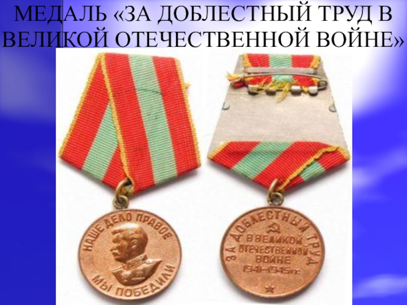 Слайд 22МЕДАЛЬ «ЗА ДОБЛЕСТНЫЙ ТРУД В ВЕЛИКОЙ ОТЕЧЕСТВЕННОЙ ВОЙНЕ»